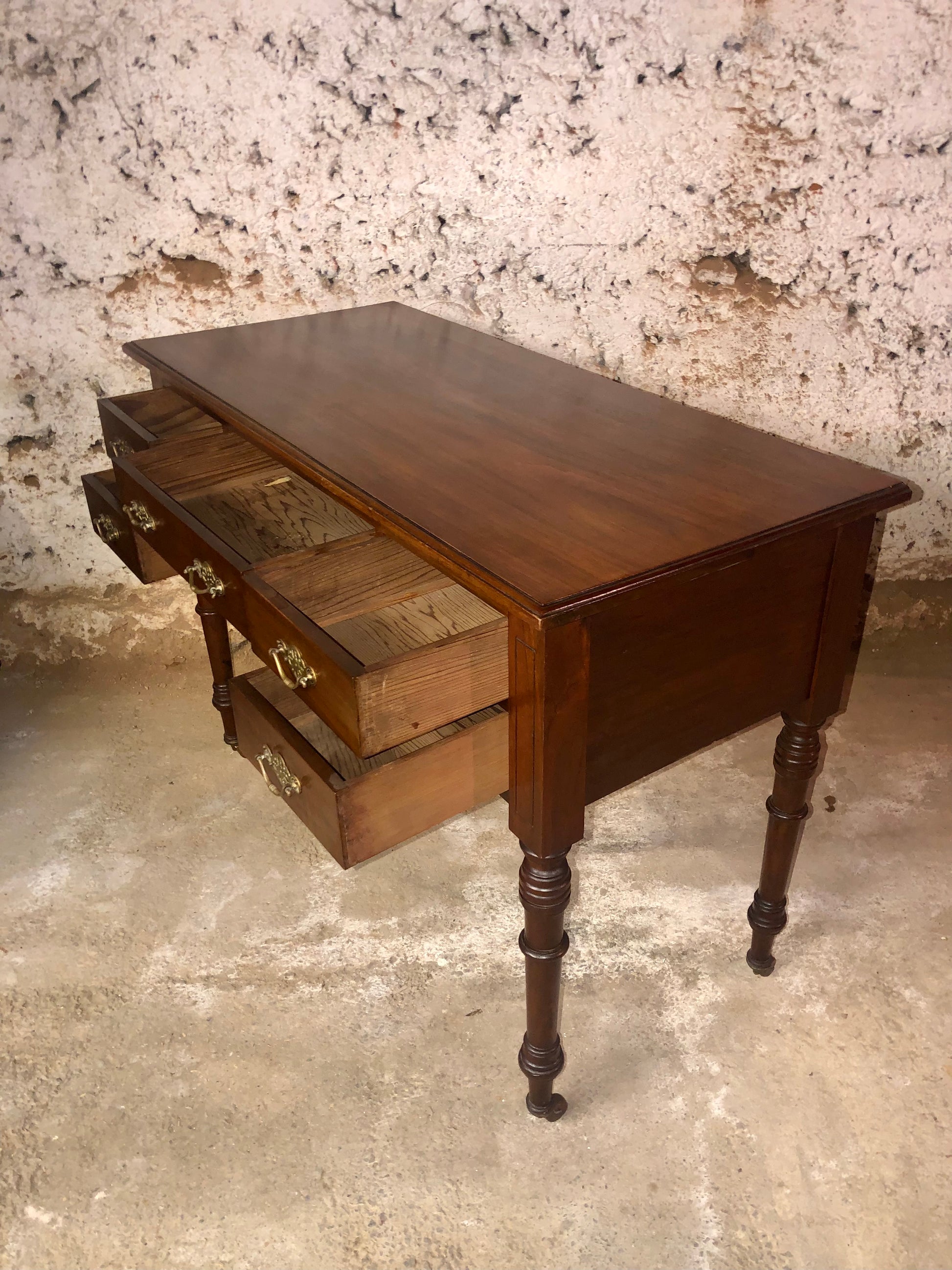 Featuring five drawers with original brass handles, turned supports, and brass and porcelain castors, this versatile piece offers both functionality and classic charm.