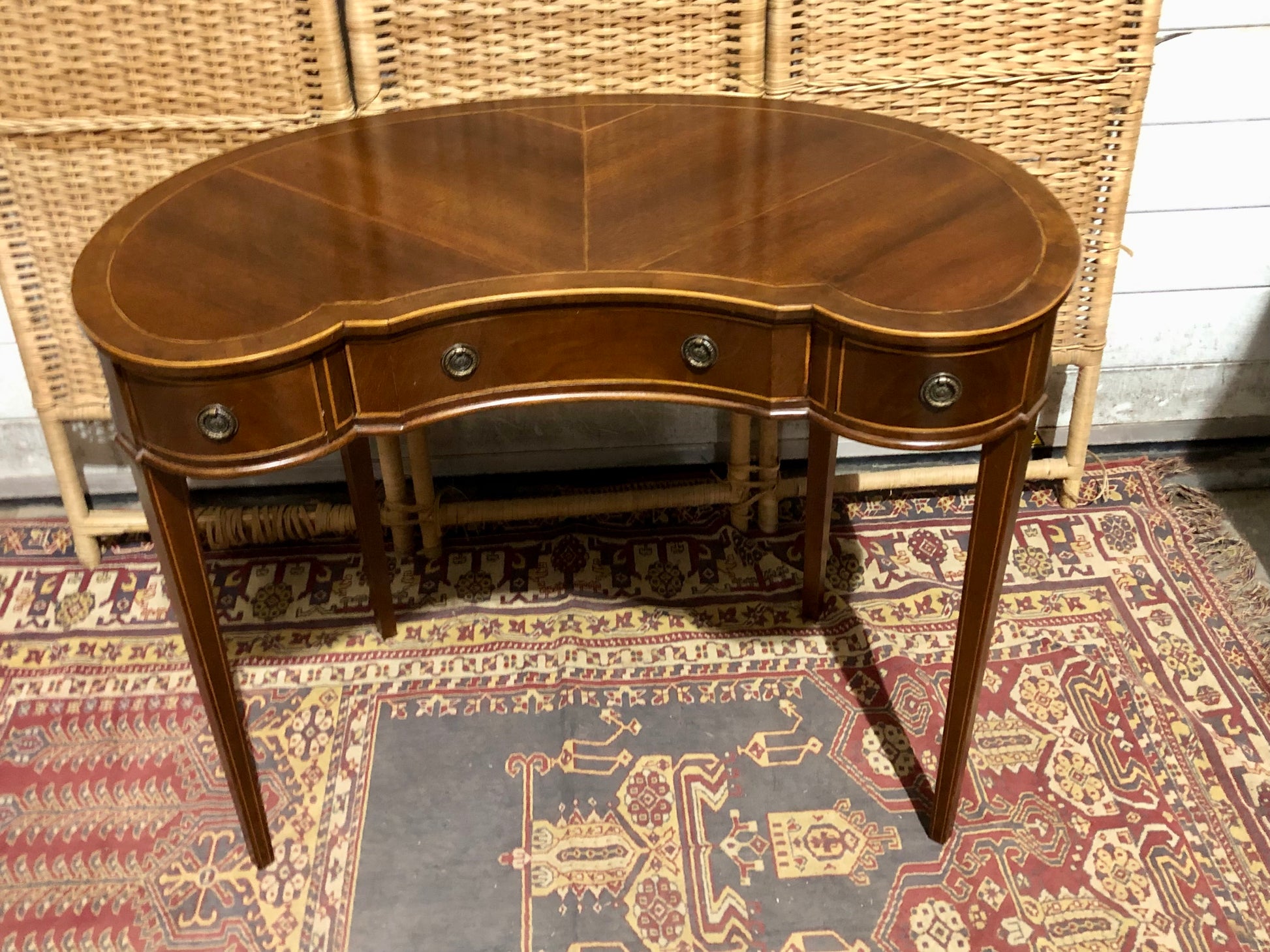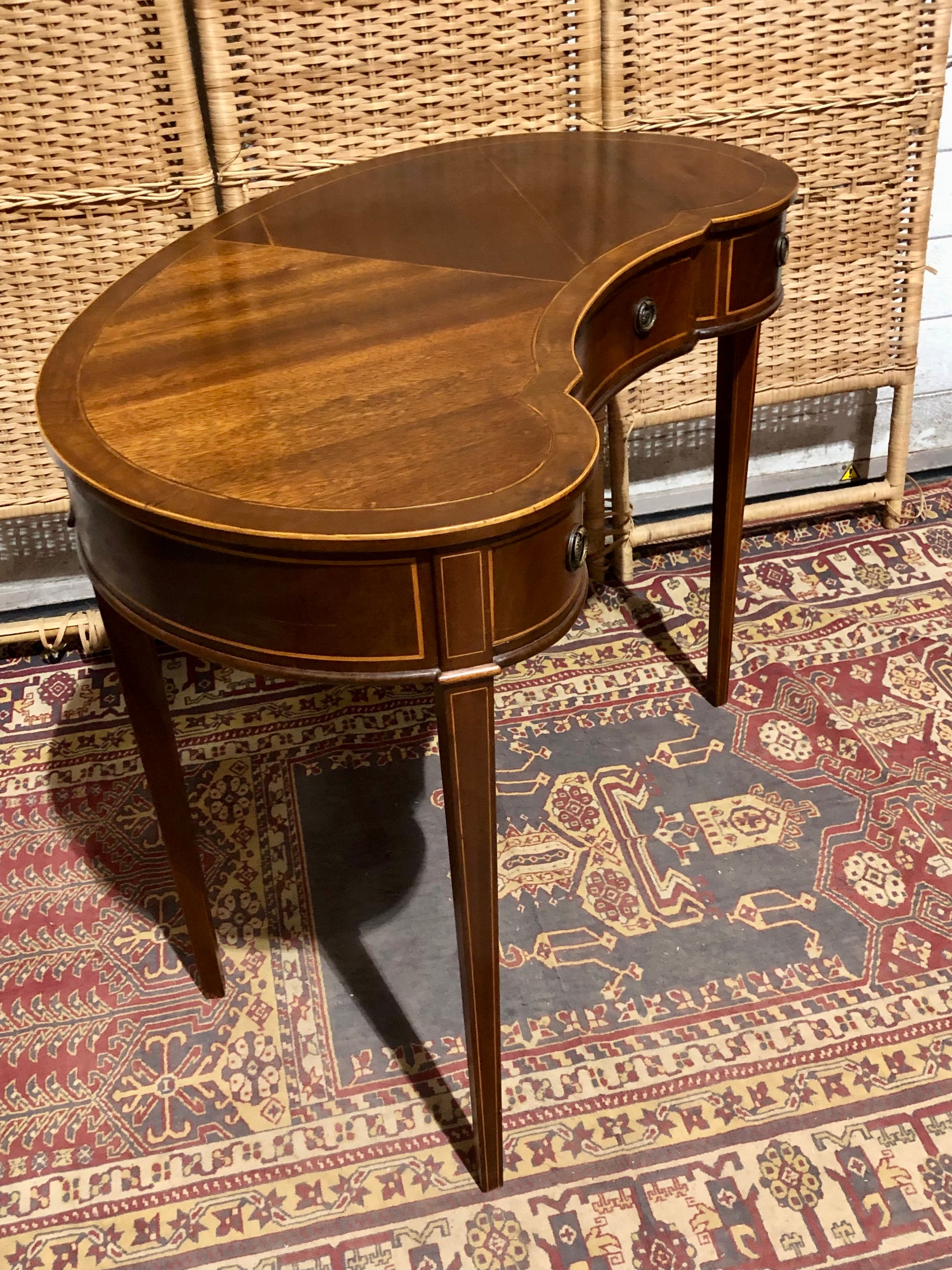 Imagine this table gracing your bedroom or study, its distinctive kidney shape and rich mahogany veneers adding a touch of vintage elegance.