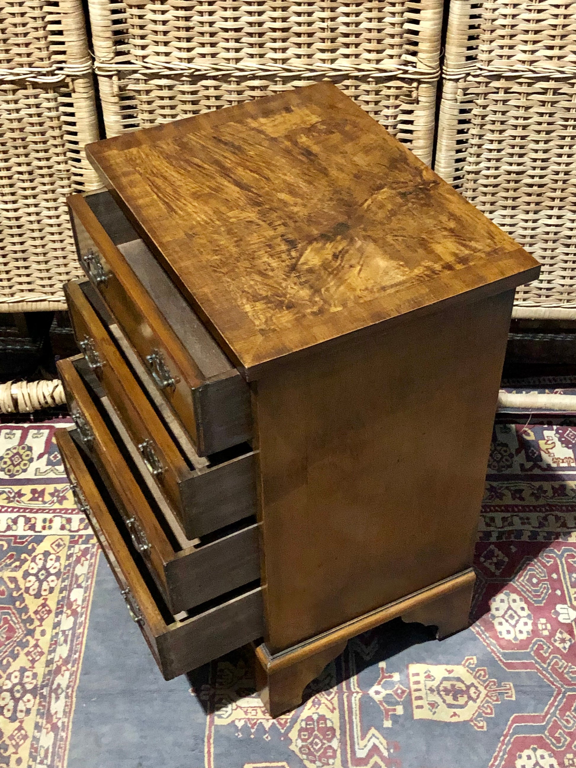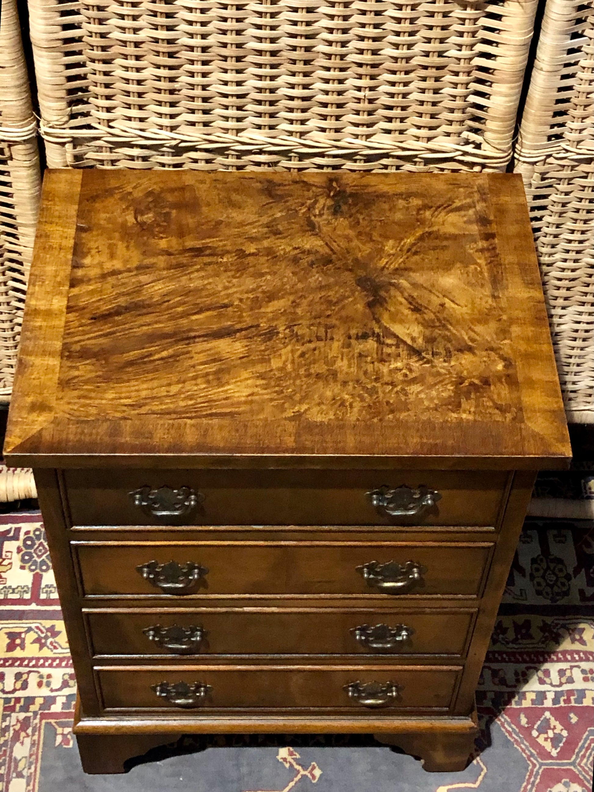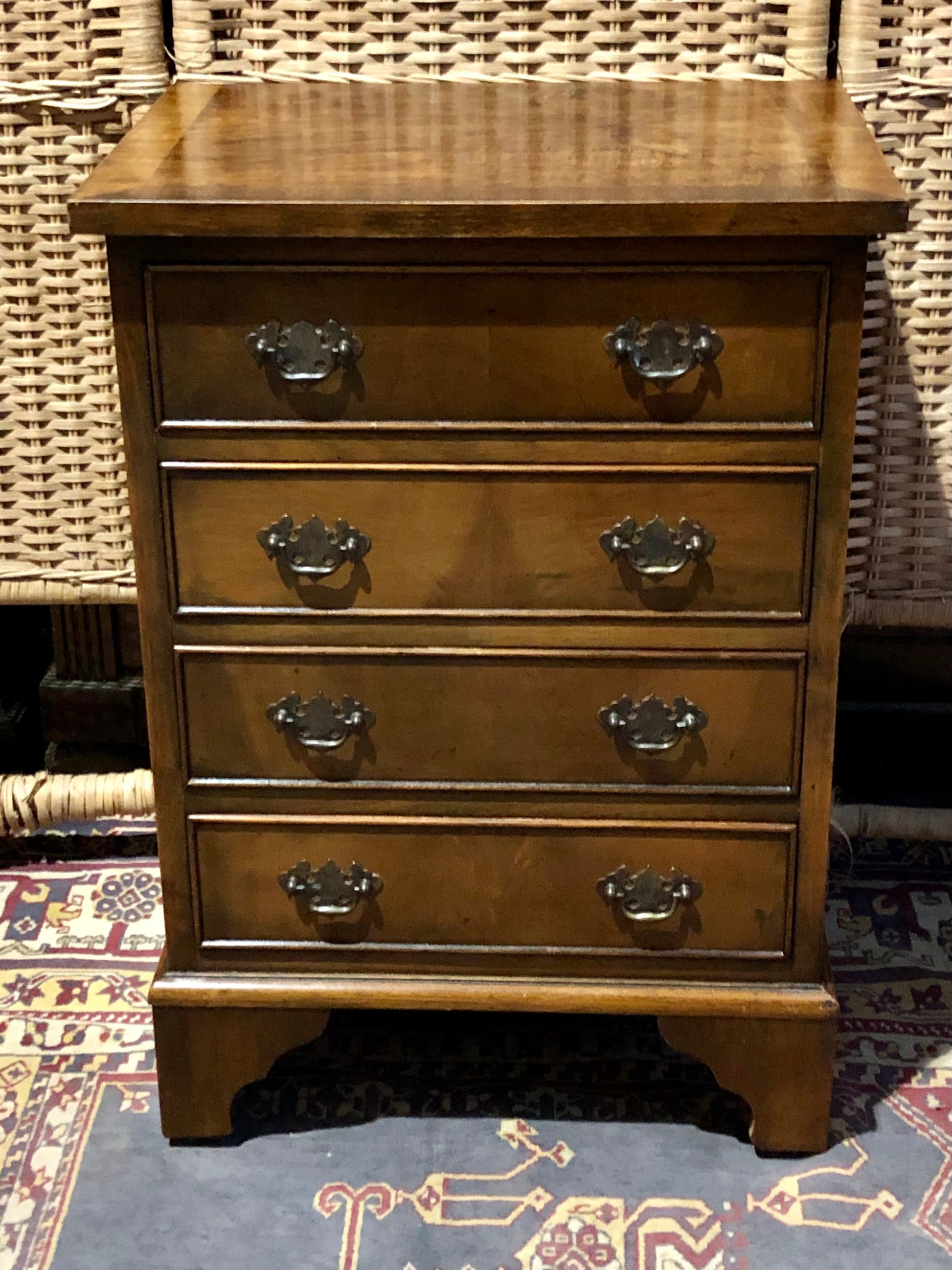 Vintage Walnut Bedside Chest — Four Drawers, Original Brass Handles, Bracket Feet