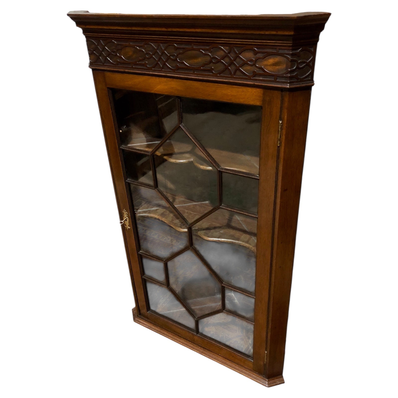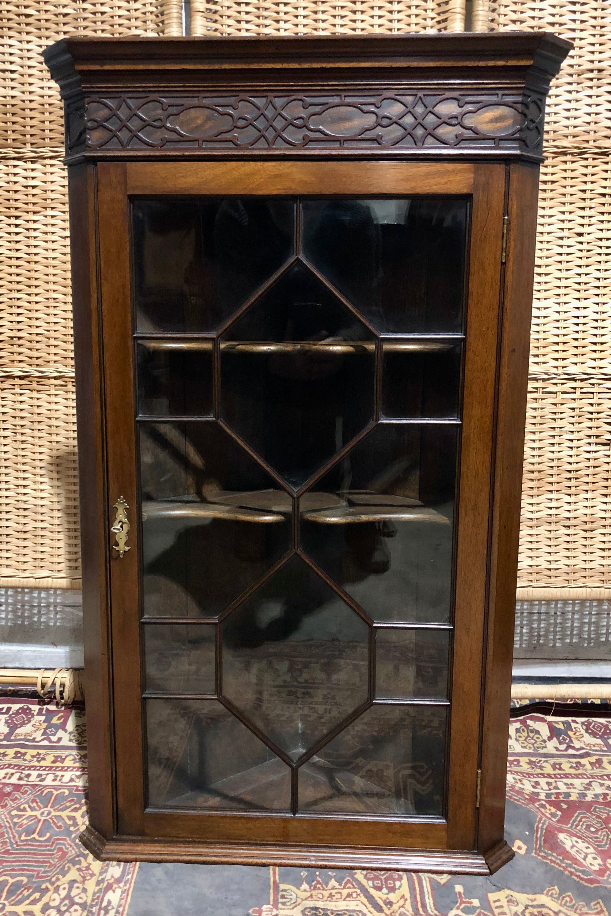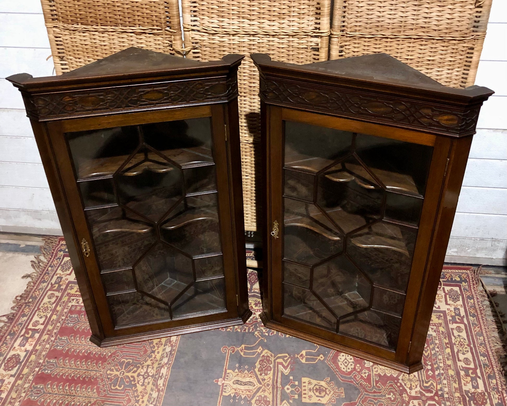 Bring a touch of refined period charm into any room with this beautiful matching pair of vintage mahogany corner cabinets, designed to hang gracefully on the wall and make the most of unused space.