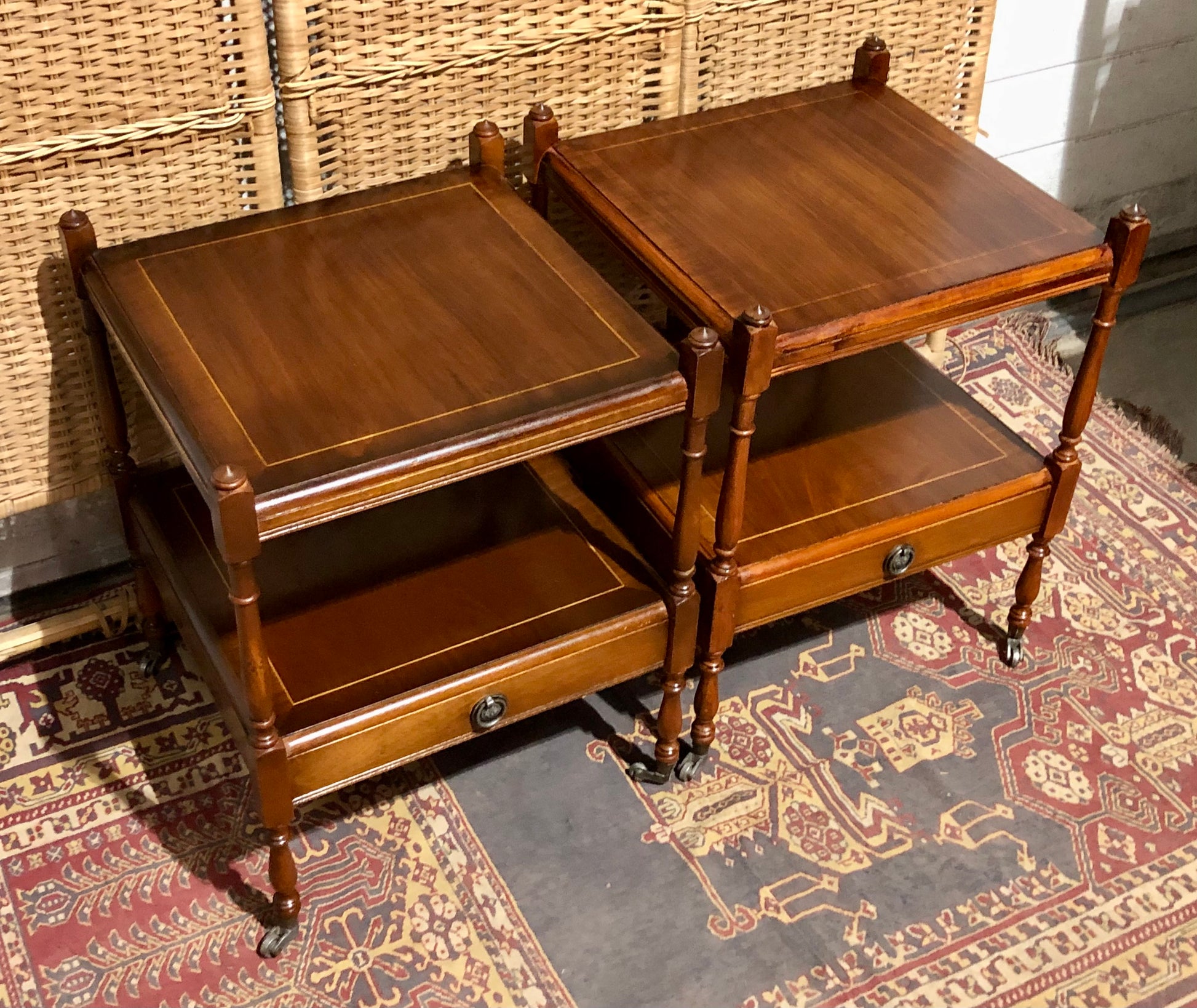 Elevate your bedroom with this exquisite pair of vintage mahogany bedside tables, where classic craftsmanship meets everyday function.