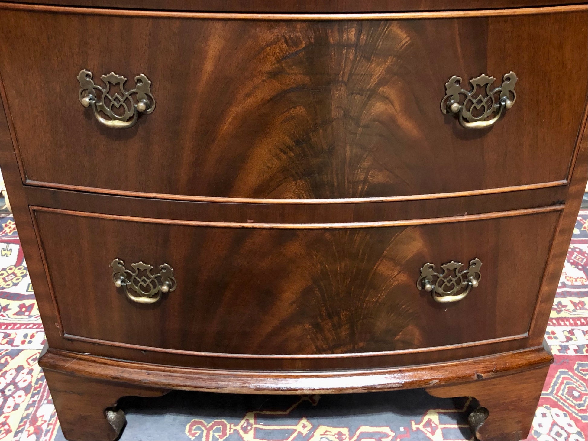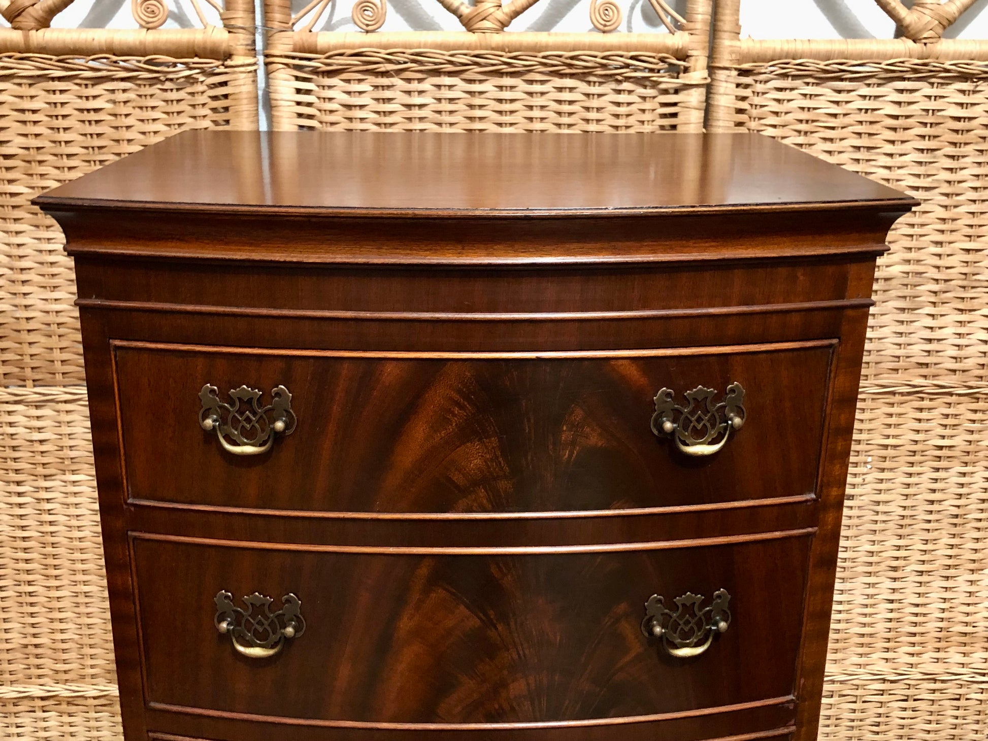 Elevate your interior with this stunning vintage tallboy chest, crafted from richly grained flame mahogany that dances with light and depth.